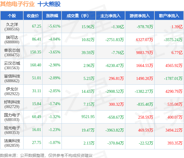 个股表现方面,其他电子行业当日领跌股为久之洋(300516),该股当日报收67.25,下跌5.61%,成交量15.96万,主力资金净流出1.3亿元。瑞可达(688800)以下跌4.04%紧随其后,该股当日成交量10.82万,主力资金净流出2751.83万元。除此之外,香农芯创(300475)、云汉芯城(301563)、富信科技(688662)均进入当日熊股之列。具体个股列表见下表: