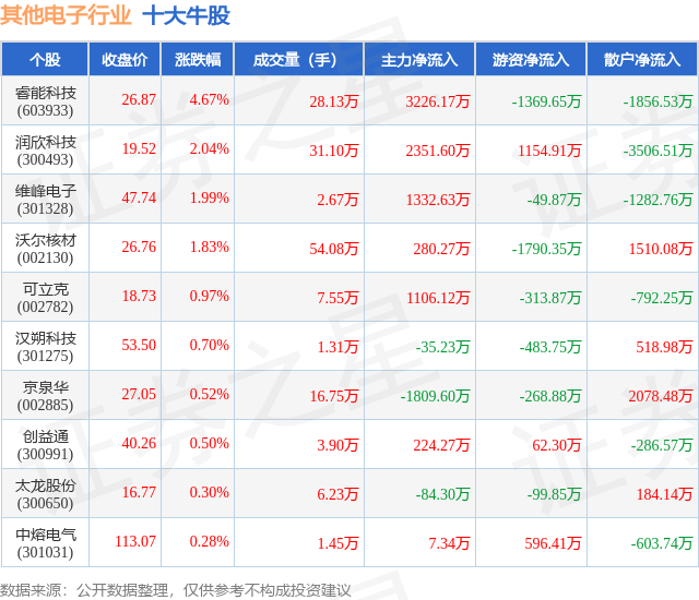 个股表现方面,其他电子行业当日领涨股为睿能科技(603933),该股当日报收26.87,上涨4.67%,成交量28.13万,主力资金净流入3226.17万元。润欣科技(300493)以上涨2.04%紧随其后,该股当日成交量31.1万,主力资金净流入2351.6万元。除此之外,维峰电子(301328)、沃尔核材(002130)、可立克(002782)均进入当日牛股之列。具体个股列表见下表: