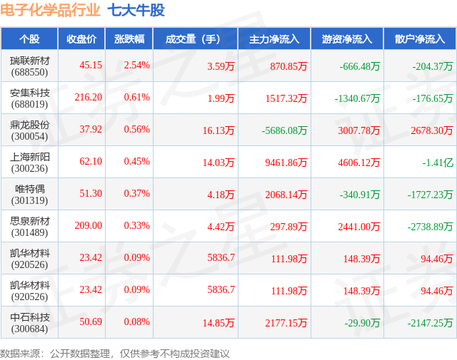 个股表现方面,电子化学品行业当日领涨股为瑞联新材(688550),该股当日报收45.15,上涨2.54%,成交量3.59万,主力资金净流入870.85万元。安集科技(688019)以上涨0.61%紧随其后,该股当日成交量1.99万,主力资金净流入1517.32万元。除此之外,鼎龙股份(300054)、上海新阳(300236)、唯特偶(301319)均进入当日牛股之列。具体个股列表见下表: