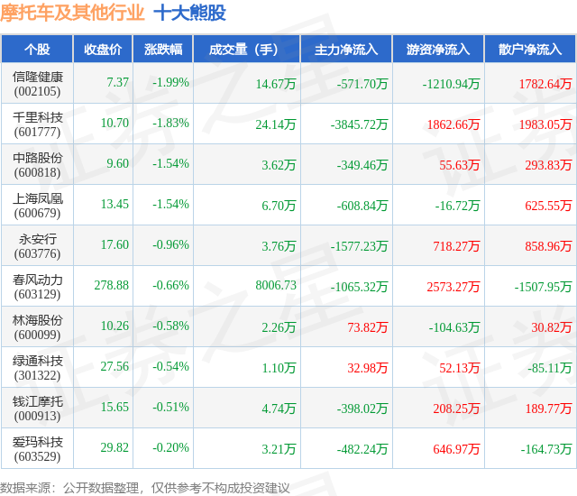 个股表现方面,摩托车及其他行业当日领跌股为信隆健康(002105),该股当日报收7.37,下跌1.99%,成交量14.67万,主力资金净流出571.7万元。千里科技(601777)以下跌1.83%紧随其后,该股当日成交量24.14万,主力资金净流出3845.72万元。除此之外,中路股份(600818)、上海凤凰(600679)、永安行(603776)均进入当日熊股之列。具体个股列表见下表: