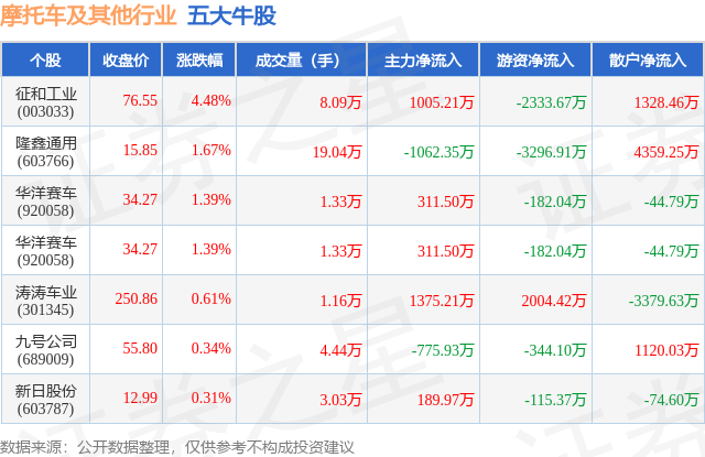 个股表现方面,摩托车及其他行业当日领涨股为征和工业(003033),该股当日报收76.55,上涨4.48%,成交量8.09万,主力资金净流入1005.21万元。隆鑫通用(603766)以上涨1.67%紧随其后,该股当日成交量19.04万,主力资金净流出1062.35万元。除此之外,华洋赛车(920058)、华洋赛车(920058)、涛涛车业(301345)均进入当日牛股之列。具体个股列表见下表: