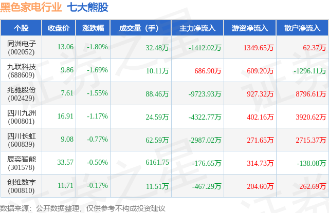 个股表现方面,黑色家电行业当日领跌股为同洲电子(002052),该股当日报收13.06,下跌1.8%,成交量32.48万,主力资金净流出1412.02万元。九联科技(688609)以下跌1.69%紧随其后,该股当日成交量10.11万,主力资金净流入686.9万元。除此之外,兆驰股份(002429)、四川九洲(000801)、四川长虹(600839)均进入当日熊股之列。具体个股列表见下表: