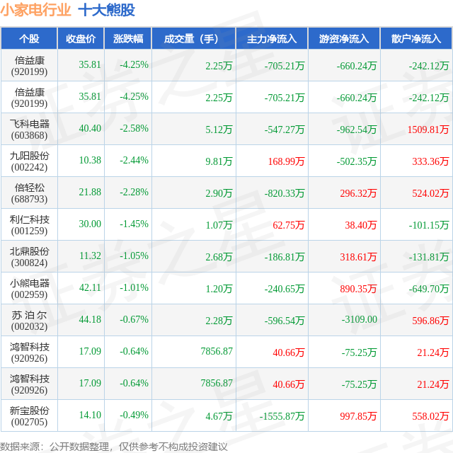 个股表现方面,小家电行业当日领跌股为倍益康(920199),该股当日报收35.81,下跌4.25%,成交量2.25万,主力资金净流出705.21万元。倍益康(920199)以下跌4.25%紧随其后,该股当日成交量2.25万,主力资金净流出705.21万元。除此之外,飞科电器(603868)、九阳股份(002242)、倍轻松(688793)均进入当日熊股之列。具体个股列表见下表: