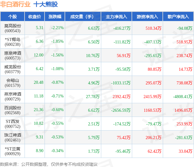 个股表现方面,非白酒行业当日领跌股为莫高股份(600543),该股当日报收5.31,下跌2.21%,成交量6.63万,主力资金净流出416.27万元。*ST椰岛(600238)以下跌1.85%紧随其后,该股当日成交量6.5万,主力资金净流出111.82万元。除此之外,惠泉啤酒(600573)、威龙股份(603779)、会稽山(601579)均进入当日熊股之列。具体个股列表见下表: