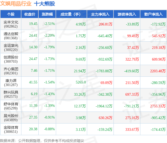 个股表现方面,文娱用品行业当日领跌股为实丰文化(002862),该股当日报收19.45,下跌2.51%,成交量4.99万,主力资金净流入206.81万元。通达创智(001368)以下跌2.2%紧随其后,该股当日成交量1.75万,主力资金净流出645.4万元。除此之外,金运激光(300220)、创源股份(300703)、齐心集团(002301)均进入当日熊股之列。具体个股列表见下表: