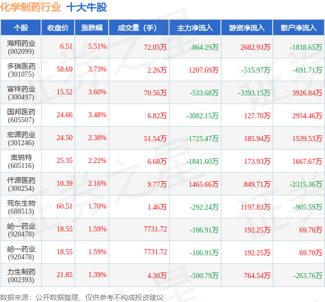 个股表现方面,化学制药行业当日领涨股为海翔药业(002099),该股当日报收6.51,上涨5.51%,成交量72.05万,主力资金净流出864.29万元。多瑞医药(301075)以上涨3.73%紧随其后,该股当日成交量2.26万,主力资金净流入1207.69万元。除此之外,富祥药业(300497)、国邦医药(605507)、宏源药业(301246)均进入当日牛股之列。具体个股列表见下表: