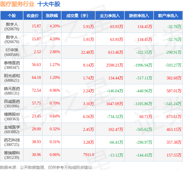 个股表现方面,医疗服务行业当日领涨股为数字人(920670),该股当日报收15.87,上涨4.2%,成交量5.91万,主力资金净流入63.93万元。数字人(920670)以上涨4.2%紧随其后,该股当日成交量5.91万,主力资金净流入63.93万元。除此之外,ST中珠(600568)、泰格医药(300347)、阳光诺和(688621)均进入当日牛股之列。具体个股列表见下表: