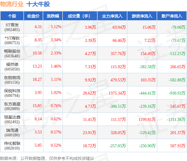 个股表现方面,物流行业当日领涨股为ST雪发(002485),该股当日报收4.31,上涨5.12%,成交量3.96万,主力资金净流入63.94万元。*ST海钦(600753)以上涨3.34%紧随其后,该股当日成交量3.39万,主力资金净流入66.46万元。除此之外,畅联股份(603648)、福然德(605050)、东航物流(601156)均进入当日牛股之列。具体个股列表见下表: