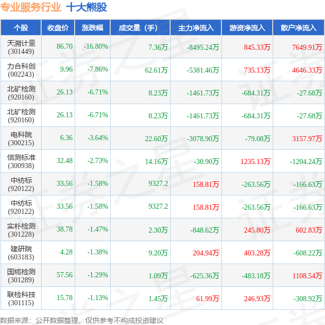 个股表现方面,专业服务行业当日领跌股为天溯计量(301449),该股当日报收86.7,下跌16.8%,成交量7.36万,主力资金净流出8495.24万元。力合科创(002243)以下跌7.86%紧随其后,该股当日成交量62.61万,主力资金净流出5381.46万元。除此之外,北矿检测(920160)、北矿检测(920160)、电科院(300215)均进入当日熊股之列。具体个股列表见下表: