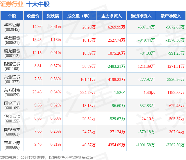 个股表现方面,证券行业当日领涨股为华林证券(002945),该股当日报收14.93,上涨3.61%,成交量28.2万,主力资金净流入6269.99万元。华鑫股份(600621)以上涨1.18%紧随其后,该股当日成交量16.13万,主力资金净流入2527.74万元。除此之外,锦龙股份(000712)、财通证券(601108)、兴业证券(601377)均进入当日牛股之列。具体个股列表见下表: