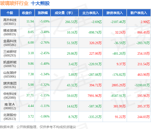 个股表现方面,玻璃玻纤行业当日领跌股为再升科技(603601),该股当日报收11.94,下跌5.69%,成交量266.53万,主力资金净流出2.69亿元。耀皮玻璃(600819)以下跌3.48%紧随其后,该股当日成交量10.16万,主力资金净流出898.74万元。除此之外,金晶科技(600586)、三峡新材(600293)、凯盛新能(600876)均进入当日熊股之列。具体个股列表见下表: