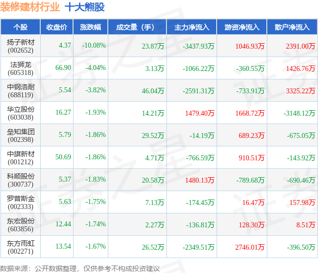 个股表现方面,装修建材行业当日领跌股为扬子新材(002652),该股当日报收4.37,下跌10.08%,成交量23.87万,主力资金净流出3437.93万元。法狮龙(605318)以下跌4.04%紧随其后,该股当日成交量3.13万,主力资金净流出1066.22万元。除此之外,中钢洛耐(688119)、华立股份(603038)、垒知集团(002398)均进入当日熊股之列。具体个股列表见下表: