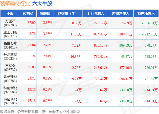 个股表现方面,装修建材行业当日领涨股为万里石(002785),该股当日报收37.0,上涨3.67%,成交量8.58万,主力资金净流入1279.12万元。亚士创能(603378)以上涨3.05%紧随其后,该股当日成交量11.35万,主力资金净流入1004.47万元。除此之外,晶雪节能(301010)、开尔新材(300234)、三棵树(603737)均进入当日牛股之列。具体个股列表见下表: