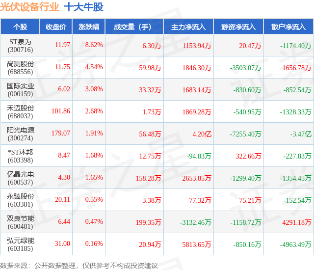 个股表现方面,光伏设备行业当日领涨股为ST泉为(300716),该股当日报收11.97,上涨8.62%,成交量6.3万,主力资金净流入1153.94万元。高测股份(688556)以上涨4.54%紧随其后,该股当日成交量59.98万,主力资金净流入1846.3万元。除此之外,国际实业(000159)、禾迈股份(688032)、阳光电源(300274)均进入当日牛股之列。具体个股列表见下表: