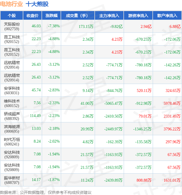 个股表现方面,电池行业当日领跌股为天际股份(002759),该股当日报收46.03,下跌7.38%,成交量173.15万,主力资金净流出9.82亿元。昆工科技(920152)以下跌4.88%紧随其后,该股当日成交量2.34万,主力资金净流入4.23万元。除此之外,昆工科技(920152)、远航精密(920914)、远航精密(920914)均进入当日熊股之列。具体个股列表见下表: