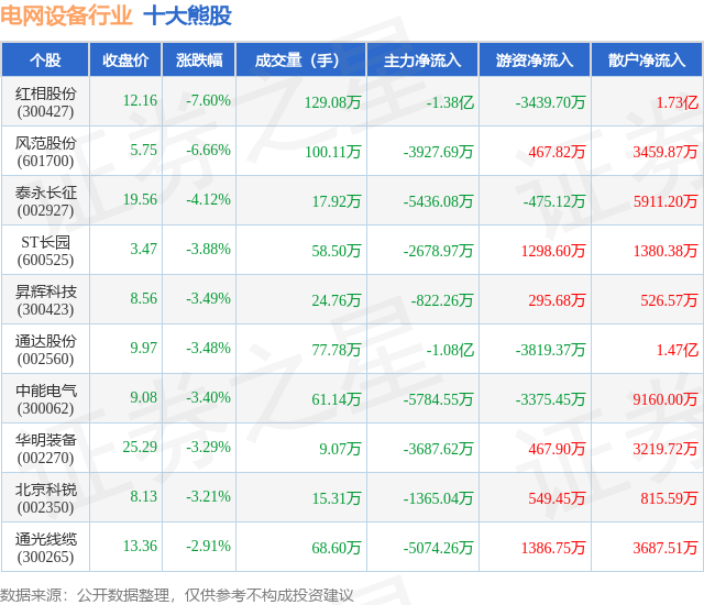 个股表现方面,电网设备行业当日领跌股为红相股份(300427),该股当日报收12.16,下跌7.6%,成交量129.08万,主力资金净流出1.38亿元。风范股份(601700)以下跌6.66%紧随其后,该股当日成交量100.11万,主力资金净流出3927.69万元。除此之外,泰永长征(002927)、ST长园(600525)、昇辉科技(300423)均进入当日熊股之列。具体个股列表见下表: