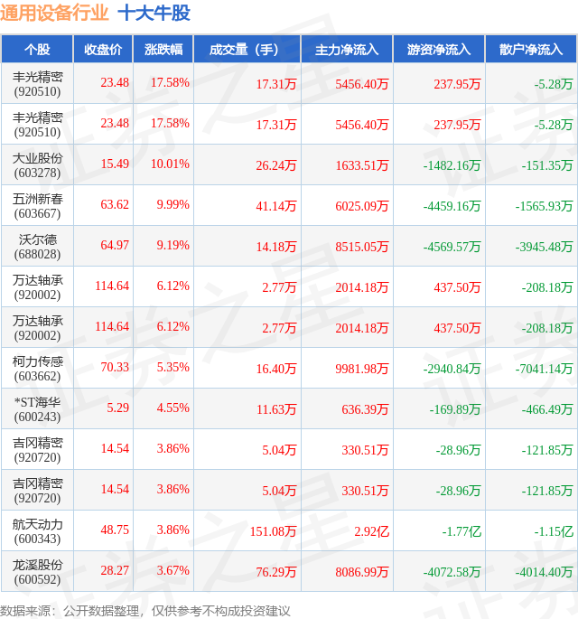 个股表现方面,通用设备行业当日领涨股为丰光精密(920510),该股当日报收23.48,上涨17.58%,成交量17.31万,主力资金净流入5456.4万元。丰光精密(920510)以上涨17.58%紧随其后,该股当日成交量17.31万,主力资金净流入5456.4万元。除此之外,大业股份(603278)、五洲新春(603667)、沃尔德(688028)均进入当日牛股之列。具体个股列表见下表: