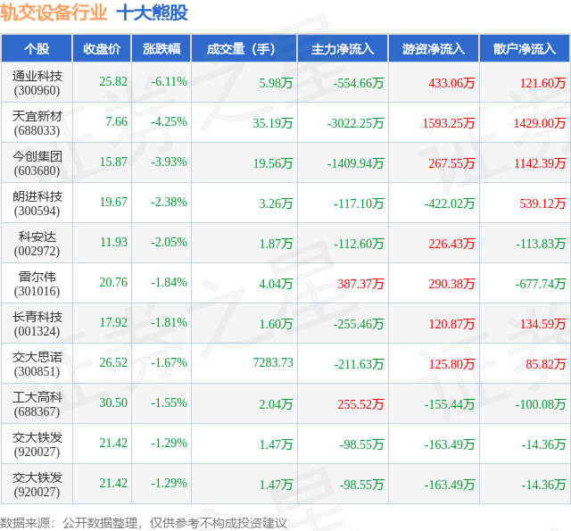 个股表现方面,轨交设备行业当日领跌股为通业科技(300960),该股当日报收25.82,下跌6.11%,成交量5.98万,主力资金净流出554.66万元。天宜新材(688033)以下跌4.25%紧随其后,该股当日成交量35.19万,主力资金净流出3022.25万元。除此之外,今创集团(603680)、朗进科技(300594)、科安达(002972)均进入当日熊股之列。具体个股列表见下表: