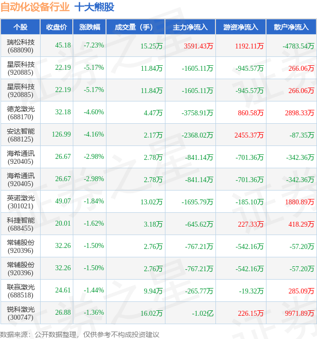 个股表现方面,自动化设备行业当日领跌股为瑞松科技(688090),该股当日报收45.18,下跌7.23%,成交量15.25万,主力资金净流入3591.43万元。星辰科技(920885)以下跌5.17%紧随其后,该股当日成交量11.84万,主力资金净流出1605.11万元。除此之外,星辰科技(920885)、德龙激光(688170)、安达智能(688125)均进入当日熊股之列。具体个股列表见下表: