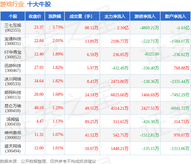 个股表现方面,游戏行业当日领涨股为三七互娱(002555),该股当日报收23.37,上涨3.73%,成交量88.12万,主力资金净流入2.1亿元。宝通科技(300031)以上涨2.01%紧随其后,该股当日成交量13.89万,主力资金净流入2106.77万元。除此之外,ST中青宝(300052)、迅游科技(300467)、冰川网络(300533)均进入当日牛股之列。具体个股列表见下表:
