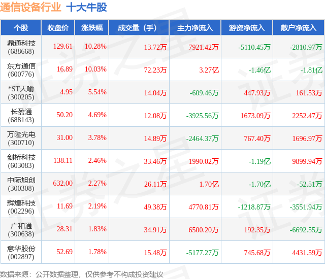 个股表现方面,通信设备行业当日领涨股为鼎通科技(688668),该股当日报收129.61,上涨10.28%,成交量13.72万,主力资金净流入7921.42万元。东方通信(600776)以上涨10.03%紧随其后,该股当日成交量72.23万,主力资金净流入3.27亿元。除此之外,*ST天喻(300205)、长盈通(688143)、万隆光电(300710)均进入当日牛股之列。具体个股列表见下表: