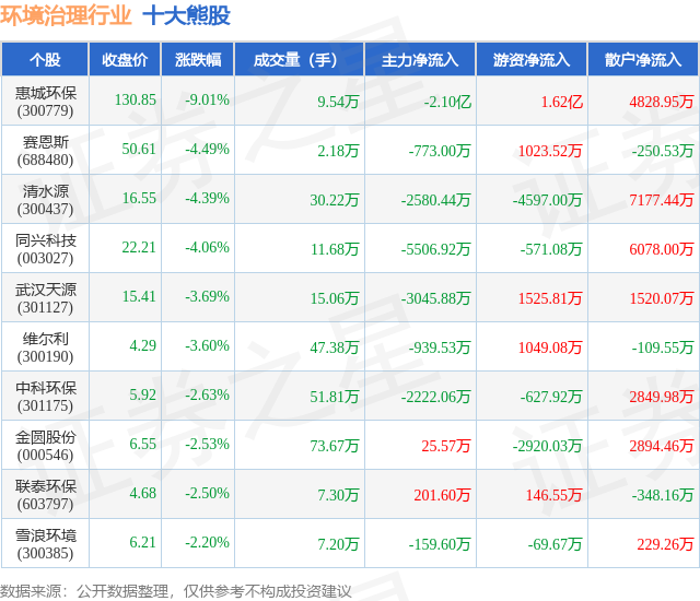 个股表现方面,环境治理行业当日领跌股为惠城环保(300779),该股当日报收130.85,下跌9.01%,成交量9.54万,主力资金净流出2.1亿元。赛恩斯(688480)以下跌4.49%紧随其后,该股当日成交量2.18万,主力资金净流出773.0万元。除此之外,清水源(300437)、同兴科技(003027)、武汉天源(301127)均进入当日熊股之列。具体个股列表见下表: