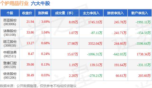 个股表现方面,个护用品行业当日领涨股为百亚股份(003006),该股当日报收21.94,上涨3.69%,成交量8.09万,主力资金净流入1745.33万元。洁雅股份(301108)以上涨1.04%紧随其后,该股当日成交量1.07万,主力资金净流出87.11万元。除此之外,延江股份(300658)、中顺洁柔(002511)、登康口腔(001328)均进入当日牛股之列。具体个股列表见下表: