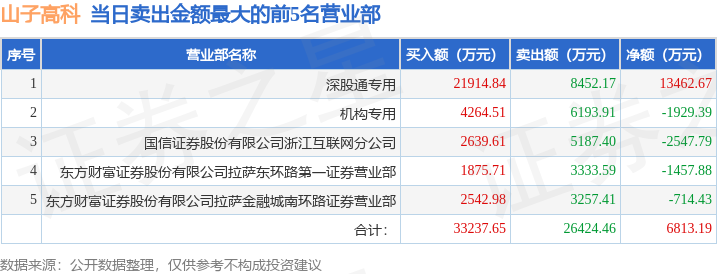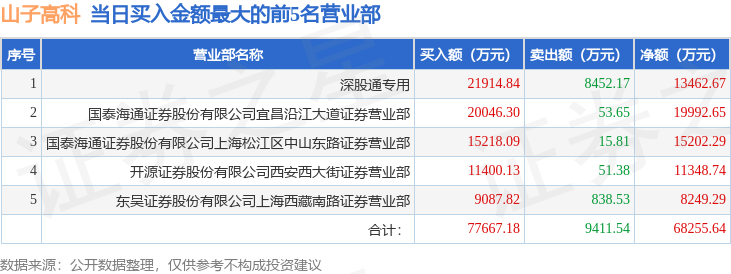 证券之星消息,沪深交易所2025年12月30日公布的交易公开信息显示,山子高科(000981)因日涨幅偏离值达到7%的前5只证券登上龙虎榜。此次是近5个交易日内第1次上榜。
