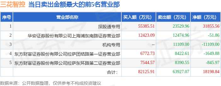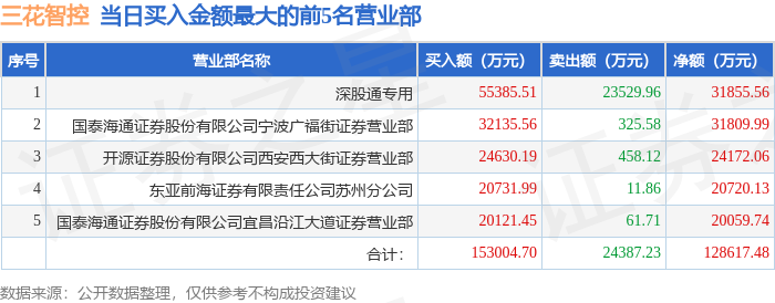 证券之星消息,沪深交易所2025年12月30日公布的交易公开信息显示,三花智控(002050)因日涨幅偏离值达到7%的前5只证券登上龙虎榜。此次是近5个交易日内第1次上榜。