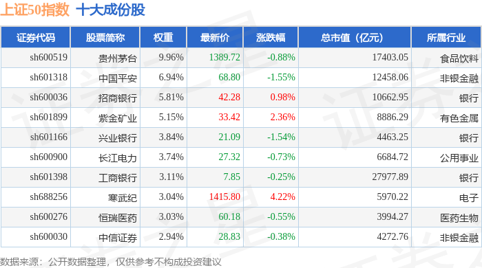 上证50(000016)指数十大成份股详情如下: