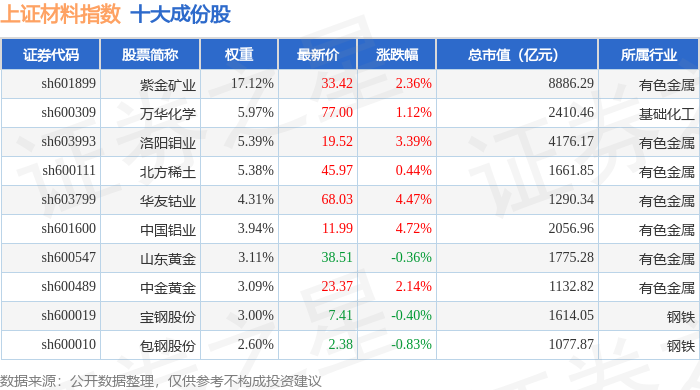 上证材料(000033)指数十大成份股详情如下: