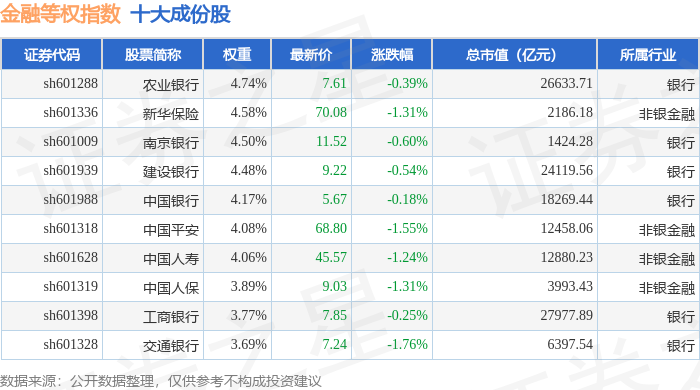 金融等权(000076)指数十大成份股详情如下: