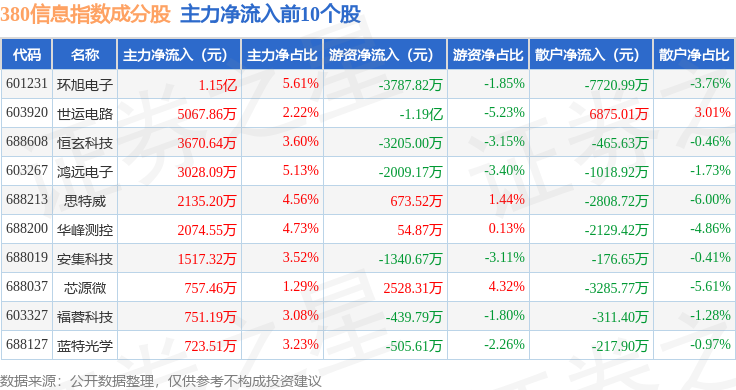 资金流向方面,380信息(000111)指数成份股当日主力资金净流出合计13.01亿元,游资资金净流入合计9084.16万元,散户资金净流入合计12.1亿元。成份股资金流向详情见下表: