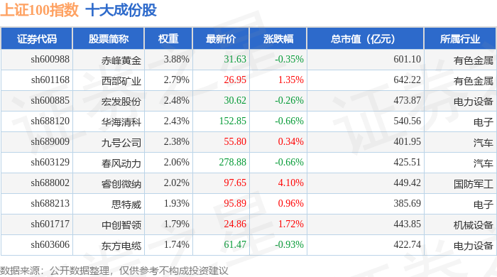 证券之星消息,12月30日,上证100(000132)指数报收于6039.29点,涨0.38%,成交386.81亿元,换手率1.34%。当日该指数成份股中,上涨的有52家,新泉股份以7.96%的涨幅领涨,下跌的有46家,瑞可达以4.04%的跌幅领跌。