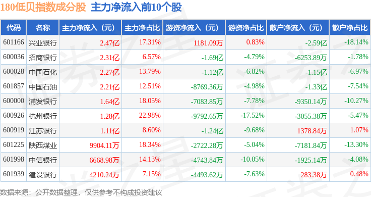 资金流向方面,180低贝(000136)指数成份股当日主力资金净流入合计1.51亿元,游资资金净流出合计1.18亿元,散户资金净流出合计3232.8万元。成份股资金流向详情见下表: