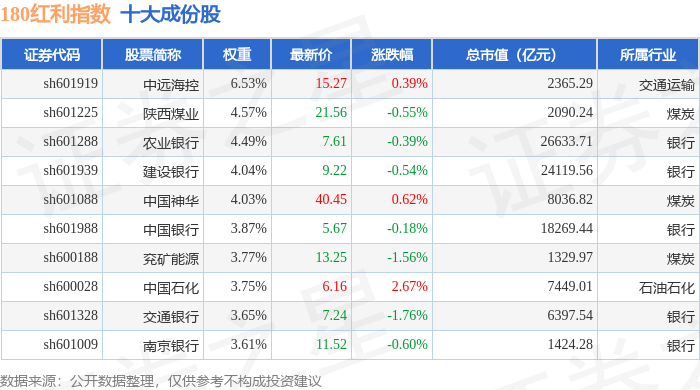 证券之星消息,12月30日,180红利(000149)指数报收于4028.83点,跌0.01%,成交334.26亿元,换手率0.2%。当日该指数成份股中,上涨的有11家,中国海油以3.18%的涨幅领涨,下跌的有19家,交通银行以1.76%的跌幅领跌。