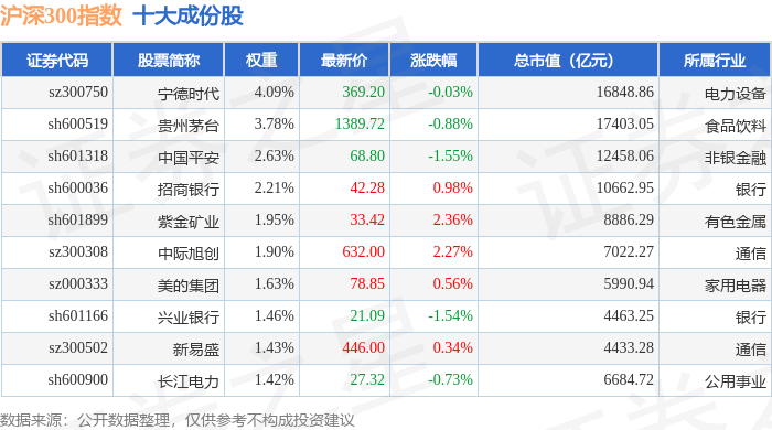 沪深300(000300)指数十大成份股详情如下: