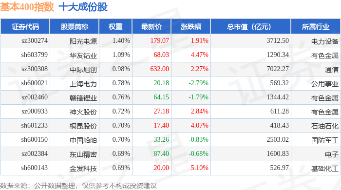 基本400(000966)指数十大成份股详情如下: