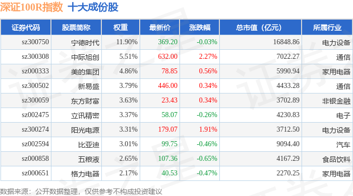 证券之星消息,12月30日,深证100R(399004)指数报收于8358.8点,涨0.49%,成交1967.68亿元,换手率1.14%。当日该指数成份股中,上涨的有51家,三花智控以9.99%的涨幅领涨,下跌的有45家,新诺威以3.38%的跌幅领跌。