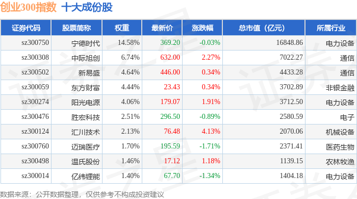 证券之星消息,12月30日,创业300(399012)指数报收于4553.99点,涨0.54%,成交3275.77亿元,换手率3.52%。当日该指数成份股中,上涨的有139家,数字认证以17.46%的涨幅领涨,下跌的有155家,惠城环保以9.01%的跌幅领跌。