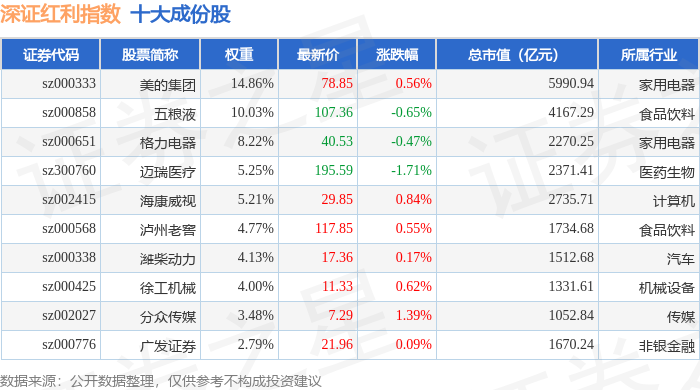 证券之星消息,12月30日,深证红利(399324)指数报收于9179.82点,涨0.32%,成交267.14亿元,换手率0.96%。当日该指数成份股中,上涨的有23家,天山铝业以4.99%的涨幅领涨,下跌的有15家,杭氧股份以2.18%的跌幅领跌。