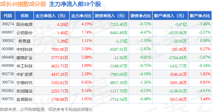 资金流向方面,成长40(399326)指数成份股当日主力资金净流出合计13.53亿元,游资资金净流出合计5239.72万元,散户资金净流入合计14.05亿元。成份股资金流向详情见下表: