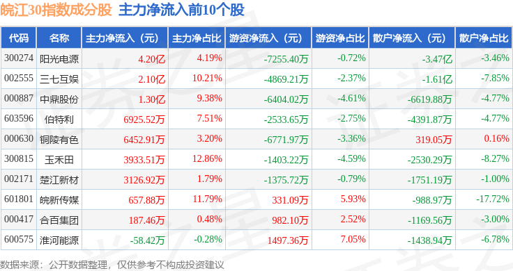 资金流向方面,皖江30(399350)指数成份股当日主力资金净流出合计4.91亿元,游资资金净流入合计1251.35万元,散户资金净流入合计4.79亿元。成份股资金流向详情见下表: