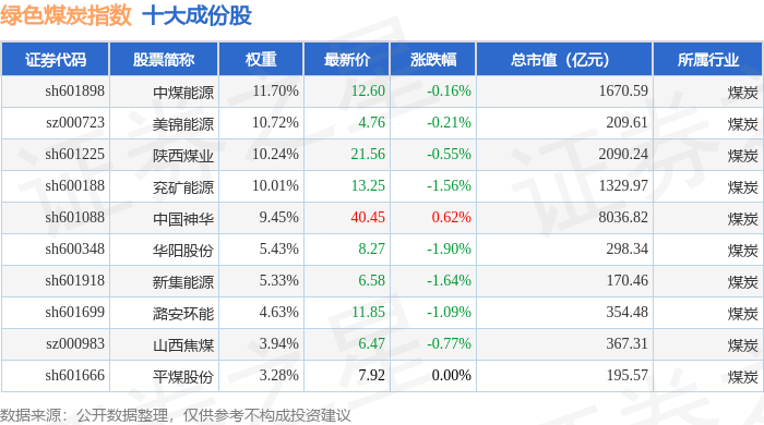 绿色煤炭(399436)指数十大成份股详情如下: