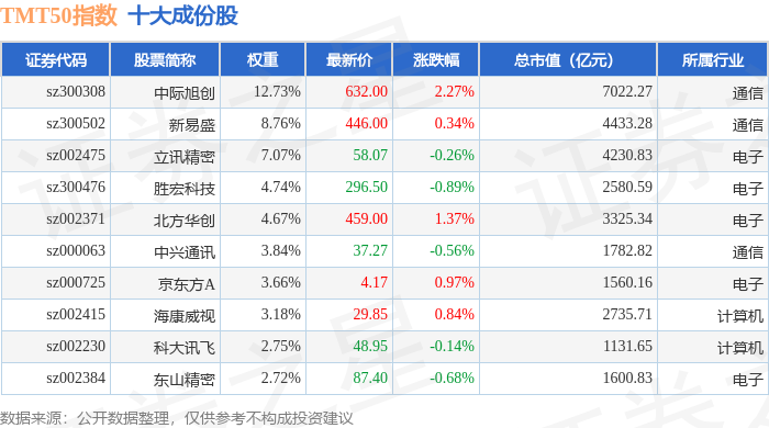证券之星消息,12月30日,TMT50(399610)指数报收于9696.66点,涨0.45%,成交1337.96亿元,换手率2.02%。当日该指数成份股中,上涨的有29家,卓胜微以8.09%的涨幅领涨,下跌的有20家,沪电股份以2.8%的跌幅领跌。
