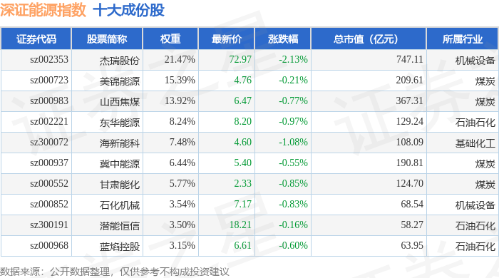 证券之星消息,12月30日,深证能源(399613)指数报收于3365.97点,跌0.89%,成交22.71亿元,换手率1.02%。当日该指数成份股中,下跌的有11家,杰瑞股份以2.13%的跌幅领跌。