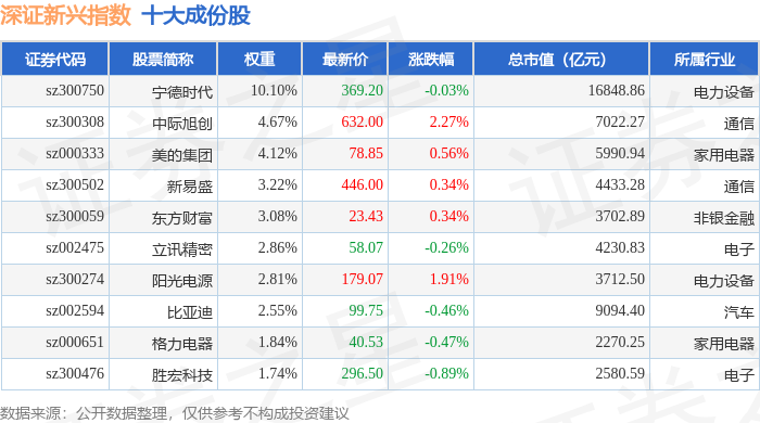 深证新兴(399641)指数十大成份股详情如下: