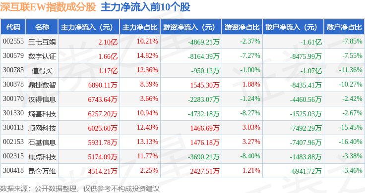 资金流向方面,深互联EW(399677)指数成份股当日主力资金净流出合计12.41亿元,游资资金净流入合计1.13亿元,散户资金净流入合计11.28亿元。成份股资金流向详情见下表: