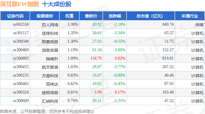 证券之星消息,12月30日,深互联EW(399677)指数报收于5551.79点,跌0.21%,成交646.09亿元,换手率2.88%。当日该指数成份股中,上涨的有64家,数字认证以17.46%的涨幅领涨,下跌的有93家,佳创视讯以6.22%的跌幅领跌。