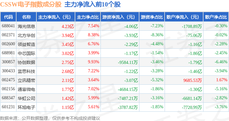 资金流向方面,CSSW电子(399811)指数成份股当日主力资金净流出合计14.75亿元,游资资金净流出合计13.75亿元,散户资金净流入合计28.5亿元。成份股资金流向详情见下表: